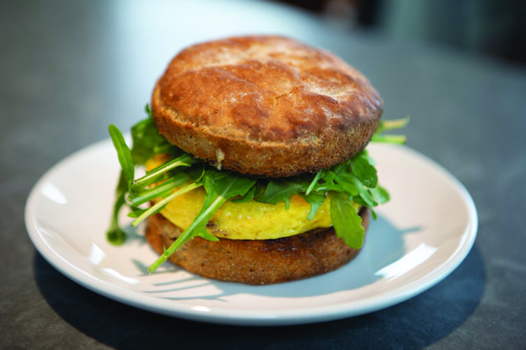 Ham & scrambled egg, arugula, cheese & garlic aioli on a locally made English Muffin