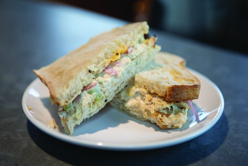 Albacore tuna, pickles, celery, mayo, mustard, arugula, pickled red onions, served on brioche