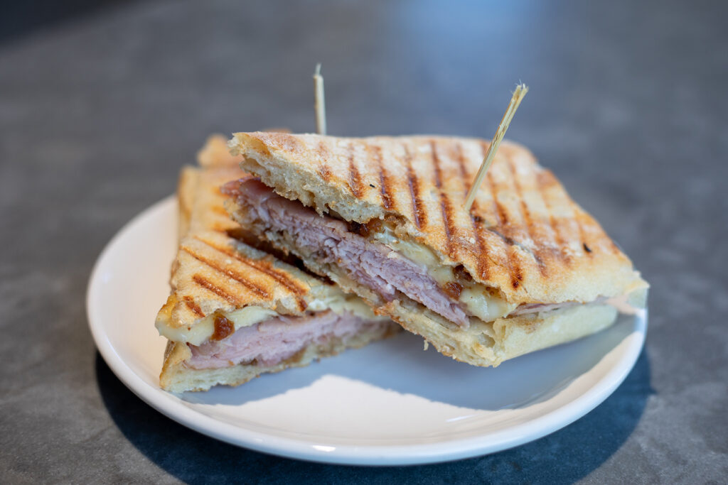 Thinly sliced ham, brie, fig spread, toasted on ciabatta