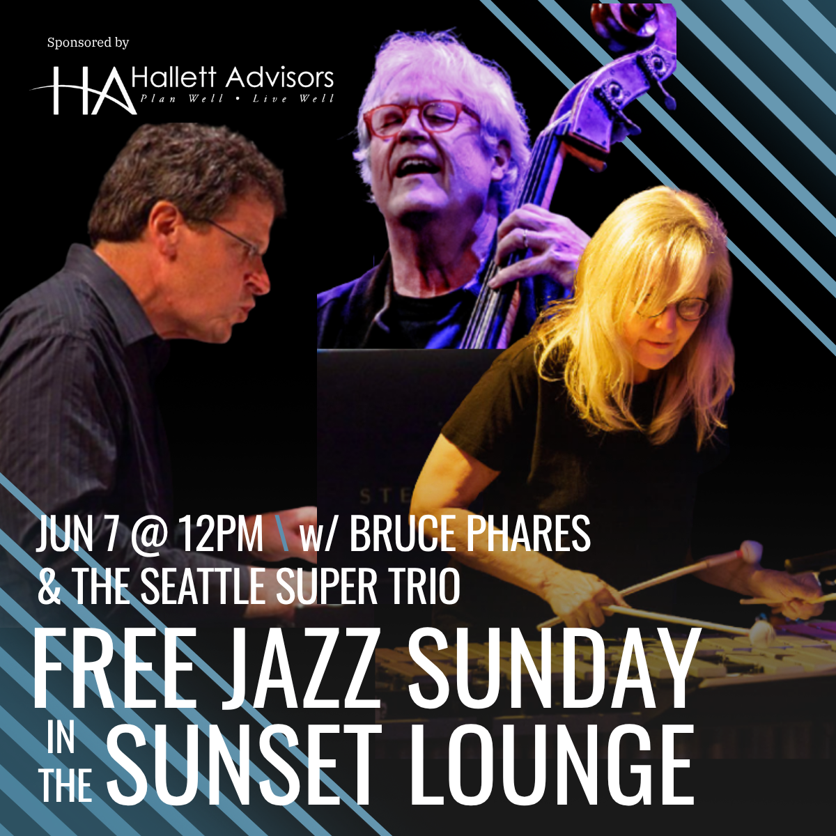 Join us for FREE JAZZ SUNDAY in the Sunset Lounge on Sunday, June 7th featuring Bruce Phares, Randy Halberstadt, and Susan Pascal – the “Seattle Super Trio”.”