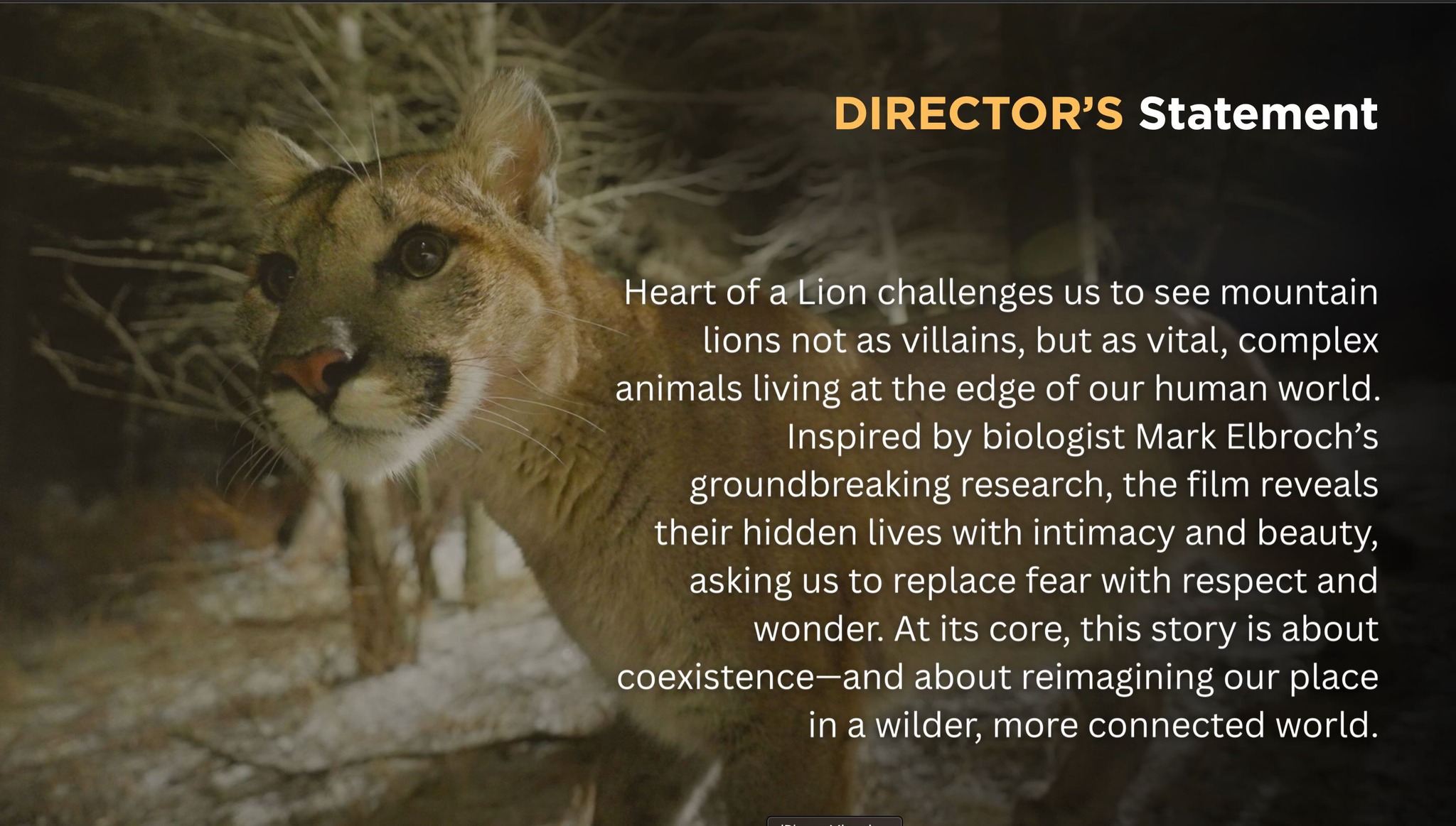 At the center of the story are two mountain lion mothers, F61 and Yoko, whose lives Elbroch has tracked for years. As his connection with these elusive cats deepens, the film reveals an intimate and rarely seen portrait of one of North America’s most misunderstood predators. Heart of a Lion explores not only the ecological role of mountain lions but also the emotional intelligence and resilience that define their lives in the wild.